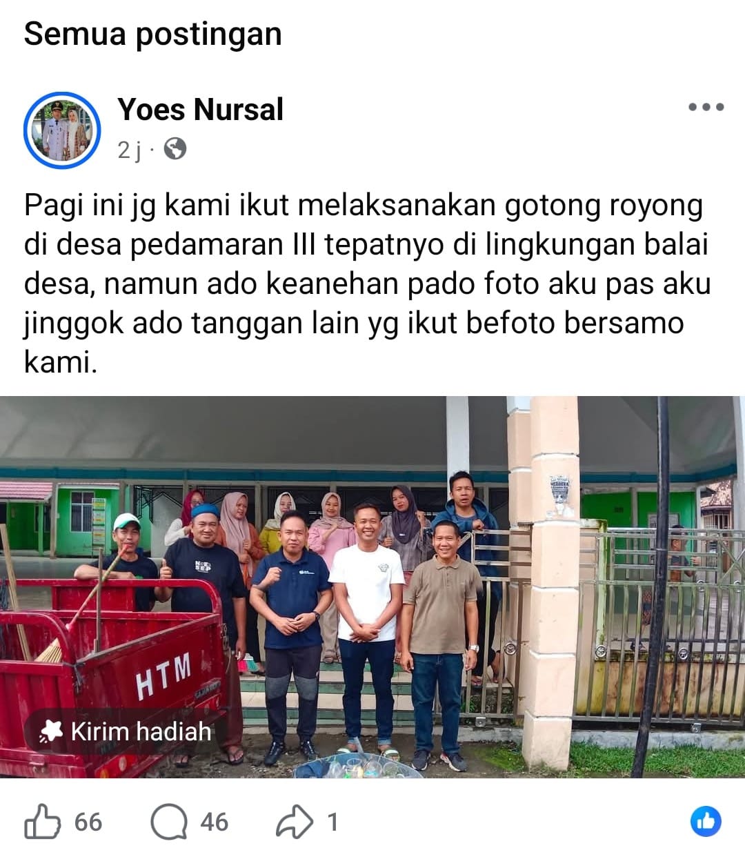 “Pagi ini kami ikut melaksanakan gotong royong di Desa Pedamaran III, tepatnya di lingkungan balai desa. Namun ada keanehan pada foto saya, terlihat ada tangan lain yang ikut berfoto bersama kami,” tulis Yoes Nursal.