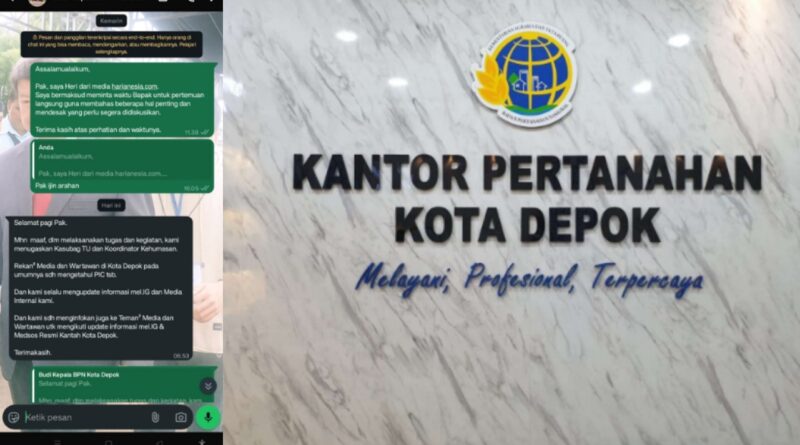DEPOK, RBO – Sikap tertutup Kepala Kantor Badan Pertanahan Nasional (BPN) Kota Depok, Budi Jaya, menuai sorotan setelah menolak permintaan konfirmasi langsung dari wartawan terkait sejumlah isu publik yang tengah mencuat dan jadi sorotan.