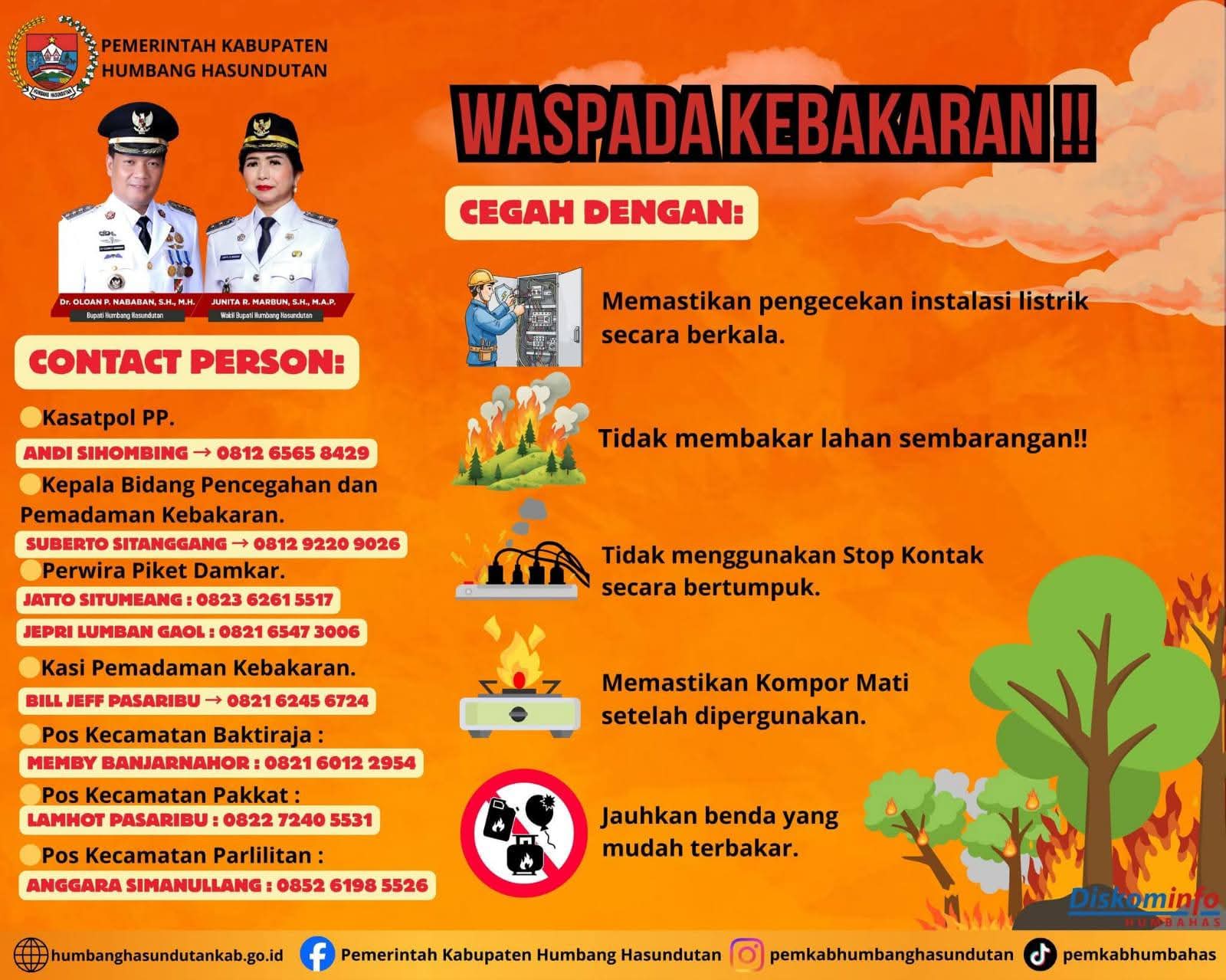 Pemerintah Kabupaten Humbang Hasundutan melalui Satuan Polisi Pamong Praja ( Satpol PP ), Bidang Pencegahan dan Pemadaman Kebakaran Kabupaten Humbahas menegaskan kesiapsiagaan penuh dengan layanan siaga 24 jam guna merespons setiap laporan kebakaran yang terjadi di wilayah Humbang Hasundutan.