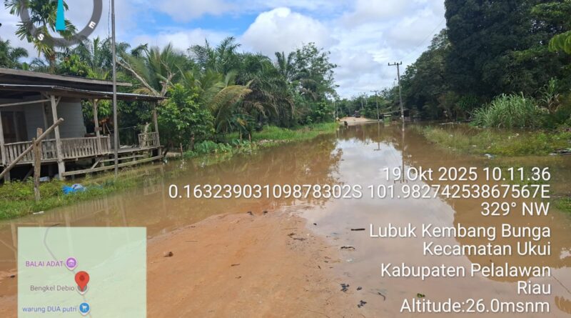 PELALAWAN, RBO – Hujan deras yang mengguyur wilayah Kecamatan Ukui sejak Sabtu malam menyebabkan Sungai Nilo meluap dan merendam permukiman warga di Desa Lubuk Kembang Bunga, Minggu (19/10/2025).