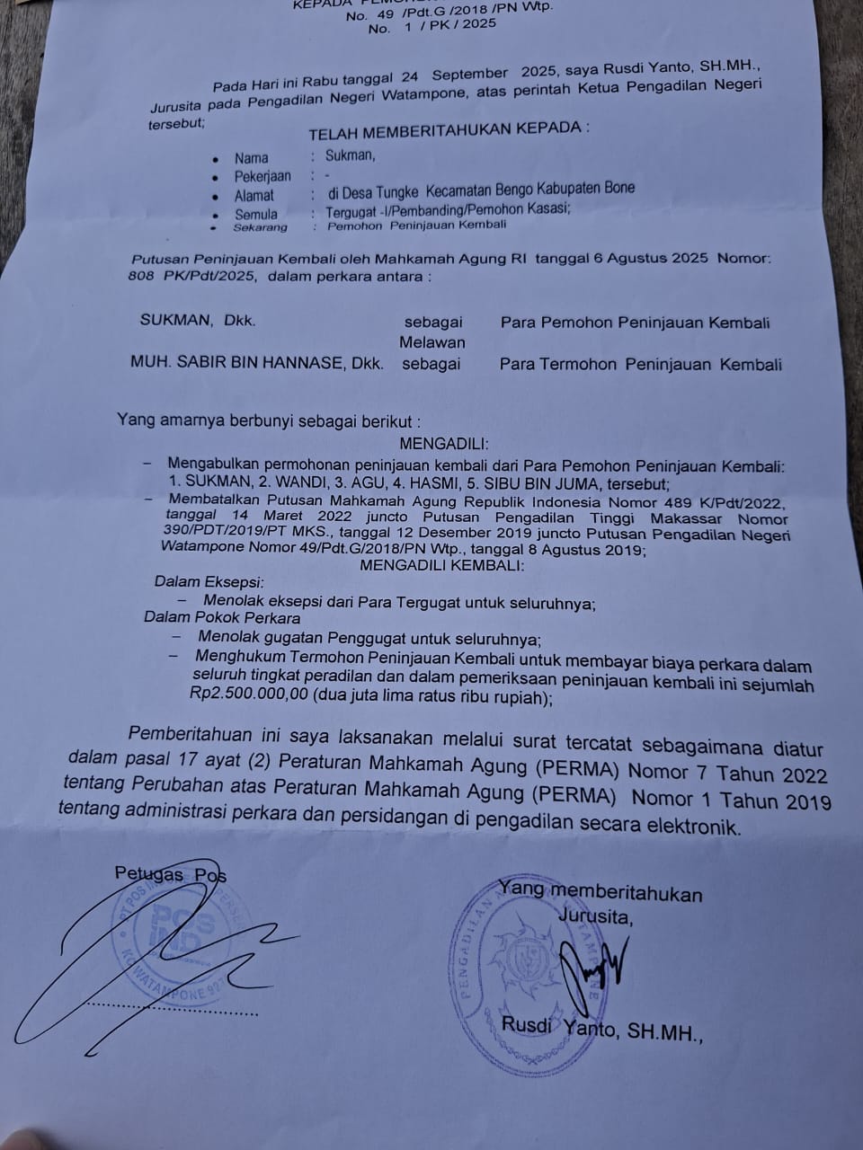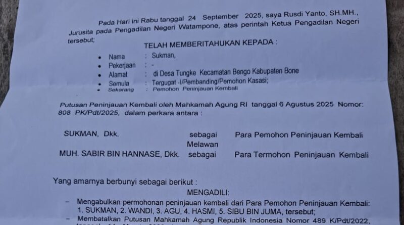 Kelima korban eksekusi lahan bersertifikat di Dusun Seppange, Desa Tungke, Kecamatan Bengo ini akhirnya bisa bernafas lega, pasca menerima selebaran surat dan membaca amar putusan Mahkamah Agung Republik Indonesia nomor: 1/PK/2025, usai pengajuan Peninjauan Kembali ( PK ) dengan bukti tanda terima memori peninjauan kembali No.49/Pdt.G/2018/PN.Wtp maret 2025 kemarin.