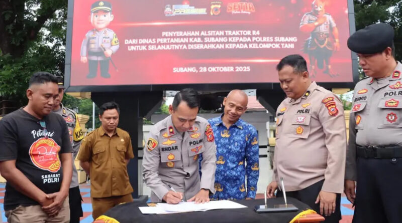 Subang, RBO – Kepolisian Resor (Polres) Subang menerima Alat dan Mesin Pertanian (Alsintan) berupa Traktor R4 merk ISEKI NT-548F dari Dinas Pertanian Kabupaten Subang untuk selanjutnya diserahkan kepada Kelompok Tani KEP Haniwung Desa Gembor Kecamatan Pagaden, binaan Polres Subang.