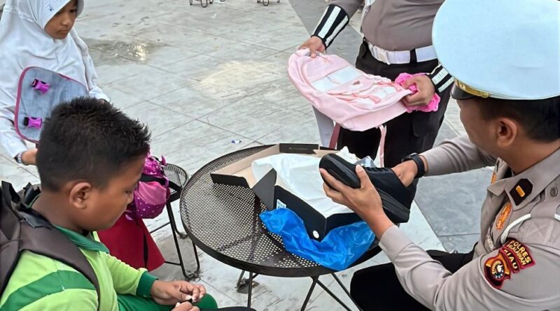 Sisi Humanis Satlantas Polres Pelalawan, Berikan Bantuan Tas dan Sepatu bagi Anak